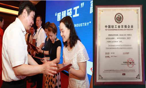 2017年6月20日,中国轻工业联合会举办的“智慧轻工”高峰论坛暨中国轻工业百强企业颁奖盛典在北京京西宾馆圆满落幕。本次颁奖盛典是中国轻工业联合会旨在为了促进轻工企业提高竞争力,鼓励轻工先进企业做大做强重要的年度活动,作为第六届中国轻工业企业家高峰论坛暨轻工百强企业颁奖盛典,大会已发展成中国轻工行业的卓著品牌论坛 ,是引领行业发展的顶级思想盛宴。
